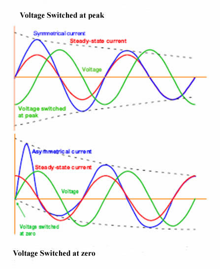 Campsite Circuit Breaker Tripping - An Annoyance that can be Avoided Does this scenario sound familiar? You arrive at your campsite, check in, pitch up and start to setup. You plug in the electrical hook-up cable and thecircuit breaker trips. It’s getting dark ! The circuit breaker is locked away in a box so you have to find the campsite warden who obliging flicks the switch back whilst muttering “all American RVs seem to do this”. You ensure all appliances are turned off before hooking up again (a good practice anyway) but to no avail – the circuit breaker trips again. It’s even darker!! Once more you call out the warden and finally the hook-up is successful. Why does this happen when I hook-up ? A professional UK electrical conversion will incorporate a suitable continuously-rated step down transformer (not a yellow building site box) which will transform the 230v hook-up to 110v in order to power the roof A/C, microwave, fridge/freezer and other 110v appliances. At the instant of switching on a transformer a large current will flow even when there is no load. This is caused by a phenomenon known as “Inrush Current”. This is because the transformer core is not fluxed and offers no impedance. This “Inrush Current” can be several times the normal full load current but is rapidly suppressed as the flux builds up and the transformer core becomes fully magnetized. Let’s consider the case of a 5kVA transformer. The full load current is 21.74 amps (Power = Volts x Amps, hence Amps = Power/Volts). The peak “Inrush Current” could be as much as 5 - 10 times the full load current or > 100amps. The campsite may have a 16amp circuit breaker which will trip at 3 – 5 times its rated value or 48 to 80amps. Clearly there is potential for tripping the circuit breaker. Campsites in Europe often only have 6amp hook-ups and hence the problem is even worse with the circuit breaker tripping at 18 to 30amps. The amount of “Inrush Current” is also dependent on the VA rating of the transformer so a conversion that utilises a 4kVAtransformer will be less susceptible than one with a 5.5kVA transformer. Why does the problem not occur every time I hook-up ? Mains electricty is in the form of an alternating current or AC. This means the direction of current flow alternates from live to neutral and neutral to live. In the UK this change in current flow occurs 50 times per second or at a frequency of 50Hz. The amount of “Inrush Current” is determined by a factor which is unfortunately outside of our control and largely down to good luck regarding the timing of connecting the hook-up. The “Inrush Current” is least if the if switching takes place when the voltage wave is at its peak. If switching takes place when the voltage is zero then the peak current is greater as illustrated in the diagrams below.